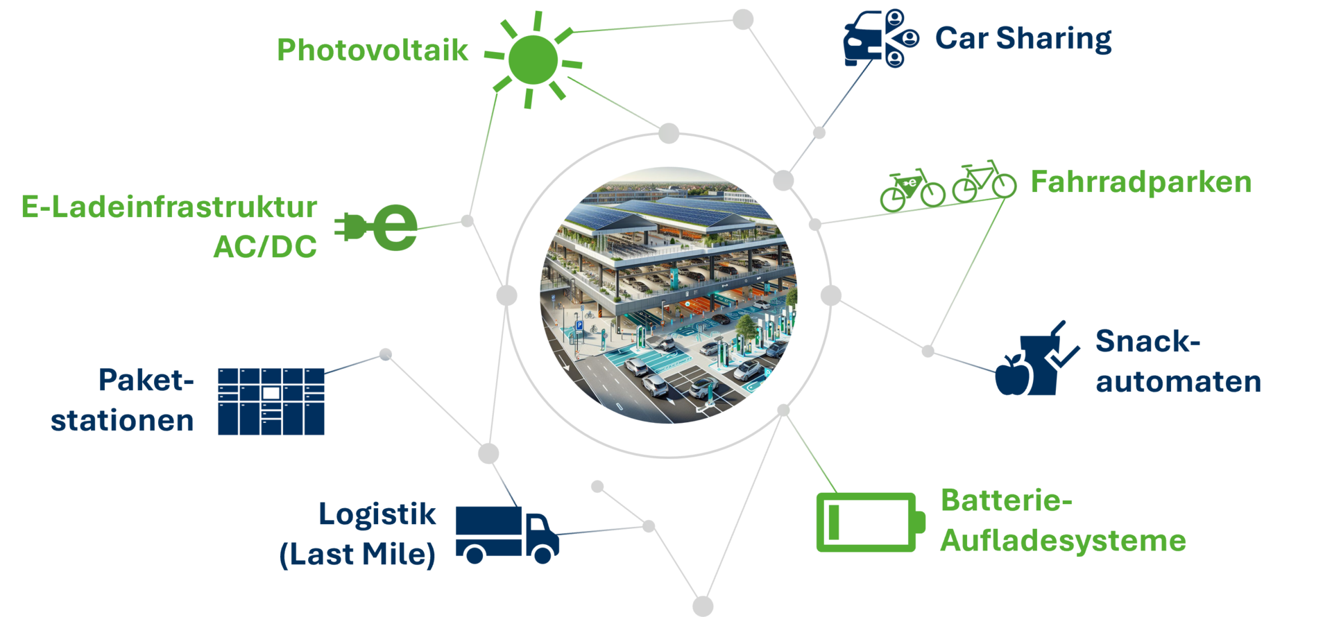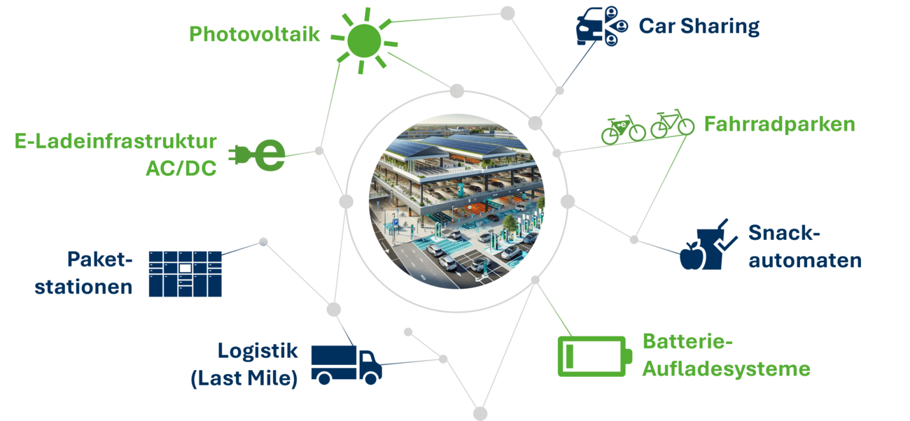 Durch den Einsatz von Photovoltaik und leistungsfähiger E-Ladeinfrastruktur für AC- und DC-Laden wird nachhaltige Energie direkt vor Ort erzeugt und genutzt. Ergänzt wird dies durch Batterie-Aufladesysteme, die Lastspitzen ausgleichen und die Energieeffizienz weiter erhöhen. Paketstationen und Last-Mile-Logistiklösungen integrieren urbane Logistik intelligent in bestehende Infrastrukturen. Angebote wie Fahrradparken, Car-Sharing sowie zusätzliche Services wie Snackautomaten machen die Standorte zu multifunktionalen Mobilitäts- und Servicehubs.